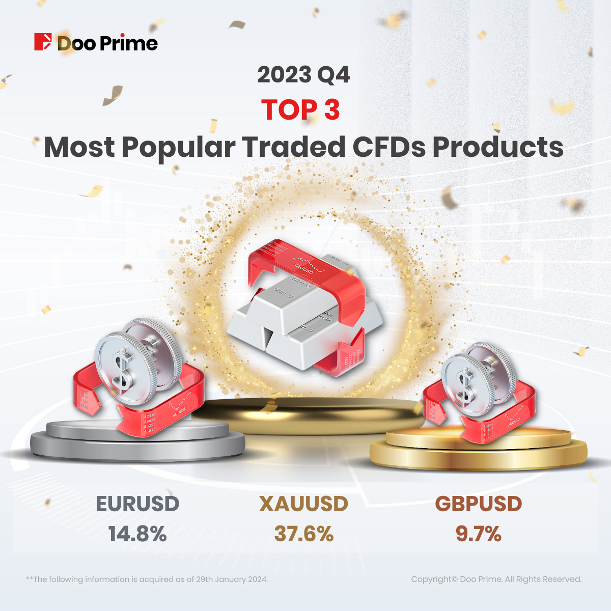 On top of the 2022 & 2023 results rewind, a notable mention goes to the top-performing products in Q4 of 2023, with XAUUSD commanding 37.5%, EURUSD at 14.8%, and GBPUSD at 9.7%.