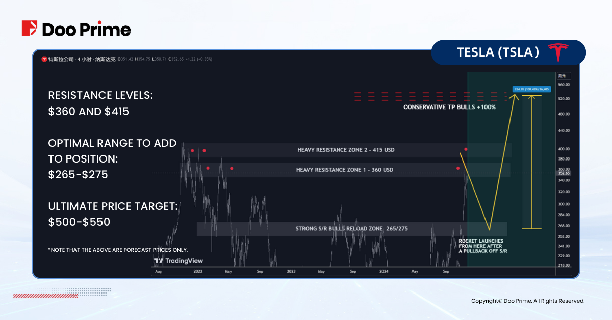 However, TSLA is expected to face pullback pressure in the near term, capped by resistance levels at USD 360 and USD 415. Bearish investors may want to look for ‘buy low’ opportunities, with the best range to add to their positions expected to be USD 265-USD 275, which is a liquidity gap that could trigger the next round of upward movement after a pullback. The overall trend for TSLA remains strong, with an eventual price target in the USD 500-USD 550 range, which has the potential to be very rewarding.