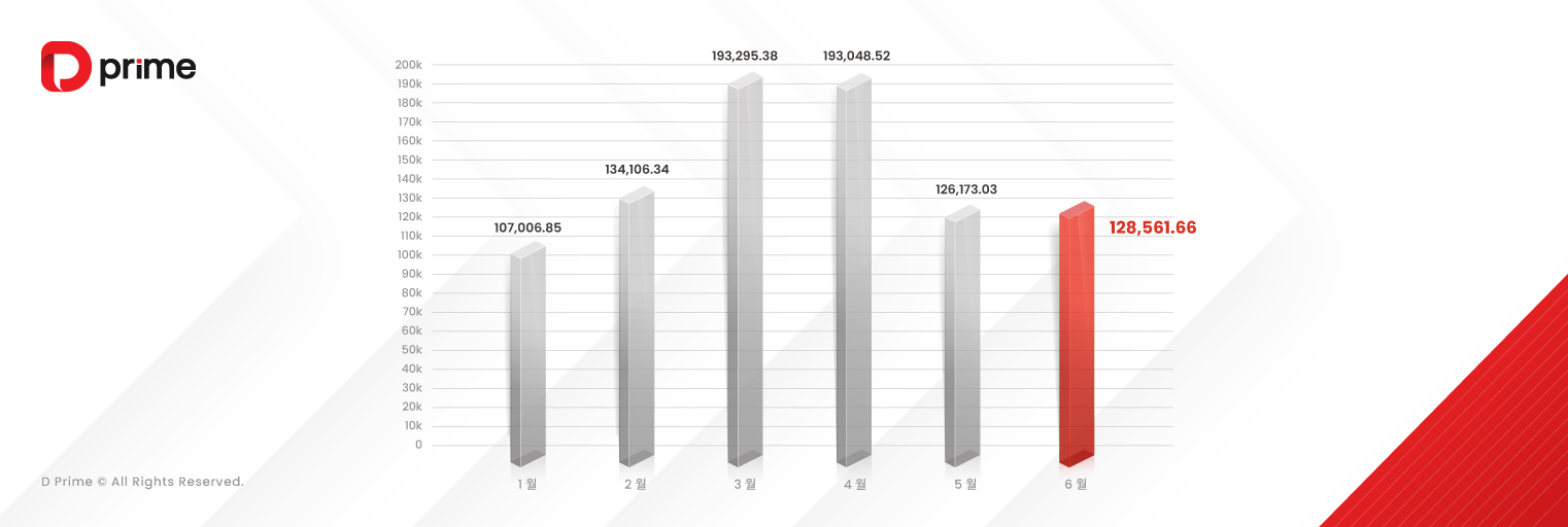 6월에는 중동 정세, 트럼프의 관세 정책 및 감세 법안 등 여러 이슈가 시장 변동을 주도했습니다. 중동의 긴장 고조로 금값과 유가가 급등 후 하락세를 보이며 금과 원유 관련 거래 상품에 대한 관심이 높아졌습니다. 한편, AI가 주도하는 투자 열풍 속에 미국 증시는 강세를 보이며 3대 지수가 상승했고 NAS100(나스닥 100 지수)과 US30(다우존스 지수)이 다시 인기 거래 종목으로 떠올랐습니다. 트럼프의 감세 법안 등의 정책 기대감이 억제되며 달러 지수는 지속적으로 약세를 보였고 유로와 파운드 등 주요 통화는 꾸준히 반등하며 관련 통화쌍의 거래도 활발히 이어졌습니다. 시장 이슈가 빠르게 바뀌는 상황 속에서도 D Prime은 전문적이고 효율적인 서비스를 통해 이용자들이 거래 기회를 포착할 수 있도록 지원하고 있습니다. 6월 총거래량은 전년 동기 대비 약 21.79% 증가해 변동성 큰 시장 환경 속에서도 지속적인 성장 탄력을 보여주고 있습니다.