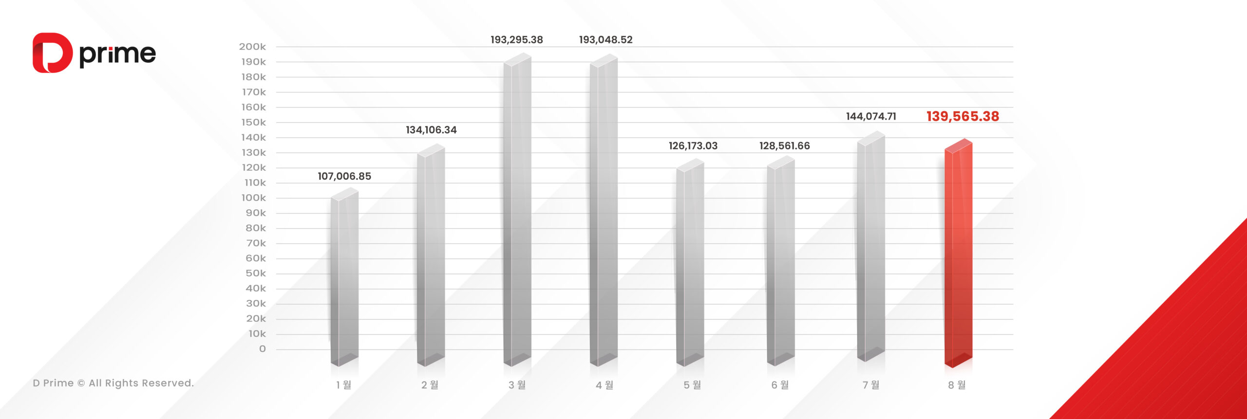 보고서에 따르면 D Prime은 2025년 8월 한 달간 약 1,395.7억 달러의 총 거래량을 기록하며전월 대비 3.16% 감소한 수치를 나타냈습니다.8월 일일 평균 거래량(ADV)**은 45.02억 달러로 7월 대비 동일하게 3.16% 하락하였습니다.