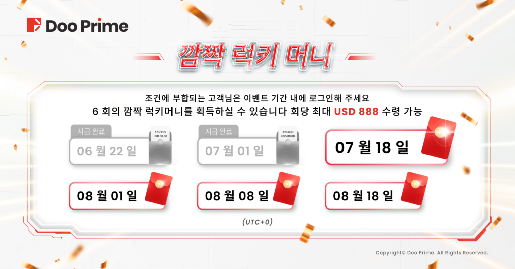 이벤트 기간 동안 Doo Prime 사용자 센터에서 USD 100 입금 및 1계약 거래를 완수하시면 지정된 시간에 타임 럭키 머니를 수령하실 수 있으며 회당 최고 USD 888 타임 럭키 머니를 수령하실 수 있습니다! 4차례 타임 럭키 머니를 발급할 예정이니 절대 놓치지 마세요!