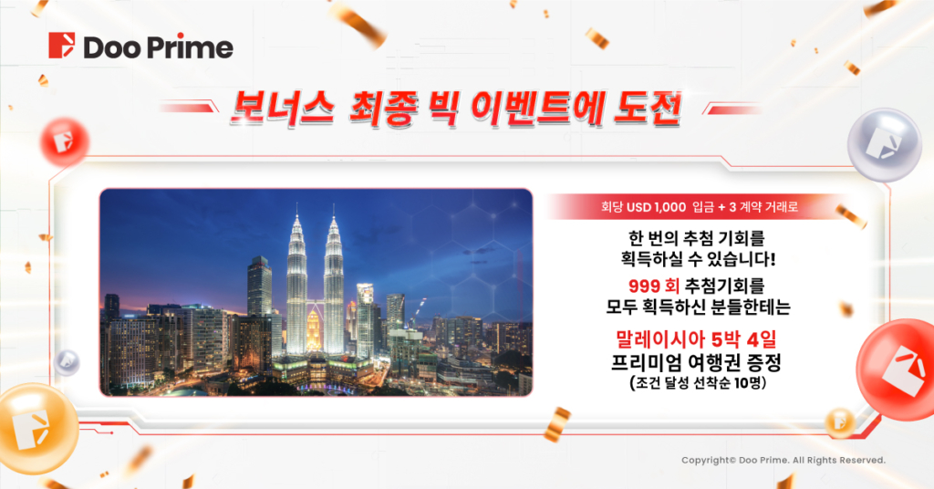 Doo Prime은 본 글로벌 연중 대 추첨 이벤트에 추가로 최종 이벤트 상을 준비하였습니다.많은 참여 부탁드립니다!999회 추첨 기회를 누적하신 첫 10명 고객님은 Doo Travel 말레이시아 5박 4일 프리미엄 여행권을 획득하실수 있습니다! Doo Prime은 이번 여행을 통해 고객님과 아름다운 글로벌 거래의 미래를 한 단계 더 그려나갈것을 기원합니다.