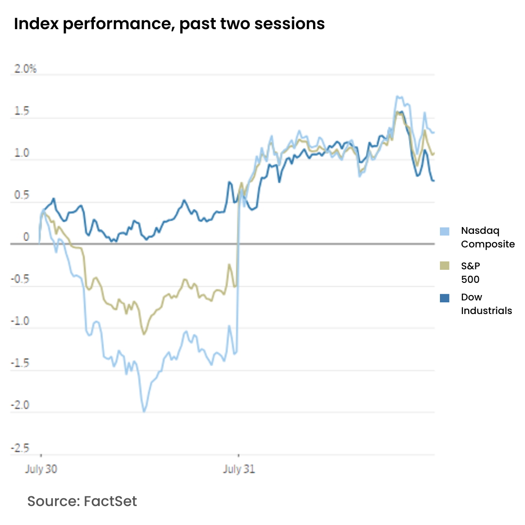 Stocks and government bonds experienced significant gains on the last day of July, marking a strong close to a fluctuating month in global markets.