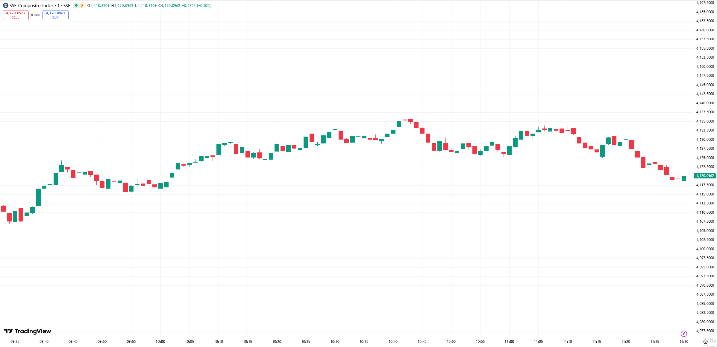 Mainland China equities advanced in morning trade. By midday, the Shanghai Composite rose 0.16%, Shenzhen Component gained 0.76%, ChiNext climbed 0.85%, Beijing Stock Exchange 50 rose 0.65%, and the STAR 50 Index jumped 2.96%. Total turnover reached RMB 1.65 trillion, down from the previous session, with over 2,900 stocks advancing.
