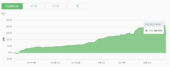 “EURUSD短线小能手” 交易信号源创建于 2022 年 11 月 3 日,自创建以来, “EURUSD短线小能手” 的收益率便明显呈现出一路上涨的趋势。2023 年 2 月 13 日,回报率更是达到 246.72% 的顶点,而此时距离其创立才仅仅过去 3 个月的时间而已。