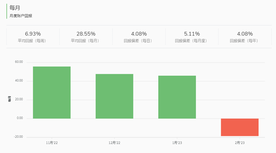 具体到每月的表现上, “EURUSD短线小能手” 的月度回报表现同样可圈可点。其中仅 2022 年 11 月这一月的回报便高达 55.78%。由于 “EURUSD短线小能手” 主要投资欧元/美元的货币对,而今年 2 月有关美联储是否维持鹰派立场的新闻不断,造成美元汇率在短期内频繁上下波动,因此 “EURUSD短线小能手” 在 2 月的回报有所回落。但即便如此,其截止目前的平均每月回报率亦有 28.55% 的亮眼表现。