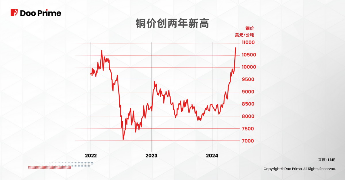 正因供需失衡,自 2023 年底以来,铜价一直处于上涨趋势。自 2024 年 2 月中旬以来,由于铜矿短缺,铜价已飙升逾 20%,达到每吨近 1 万美元的两年高点。
