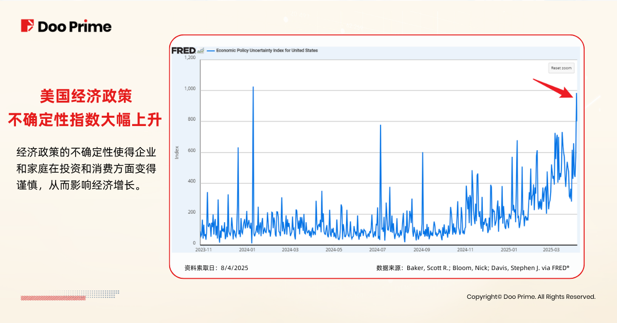 特朗普关税公布后,美国经济政策不确定性指数大幅上升,企业在面对经济政策的不确定性时,往往会推迟或减少投资,从而令市场预计美国经济今年将陷入衰退。