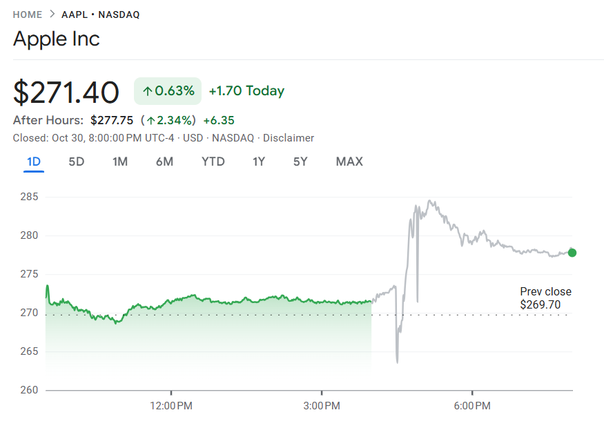 10 月 30 日至 31 日,苹果(AAPL)公布第四季度财报,营收同比增长 7.9% 至 1024.7 亿美元,超出市场预期的 1016.9 亿美元;每股收益(EPS)1.85 美元,同样优于预期的 1.76 美元。业绩增长主要受 iPhone 17 系列销售强劲带动。