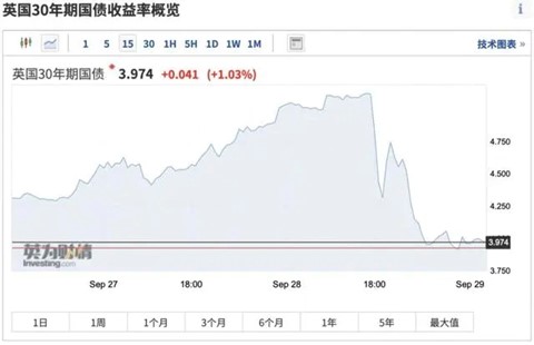 英国央行宣布无限量临时购债,震动市场,声明公布后,英国国债全线暴涨。英国 10 年期国债收益率重挫近 60 个基点,一度失守 4% 关口;30 年期国债收益率一度重挫超 120 个基点至 3.974%,创下史上最大单日跌幅。;英国股市亦上演深 V 反弹,由大跌 2% 转涨 0.3%。英国 10 年期和 30 年期国债收益率曲线自 2008 年以来首次倒挂。在声明发布前,30 年期国债收益率一度飙升至 1998 年来的新高。 英央行此次行动被视为救市,不过这样的力度或许还远远不够,市场仍期待英央行启动暴力加息。 “如果市场功能失调持续或恶化,将对英国的金融稳定性构成重大风险”。