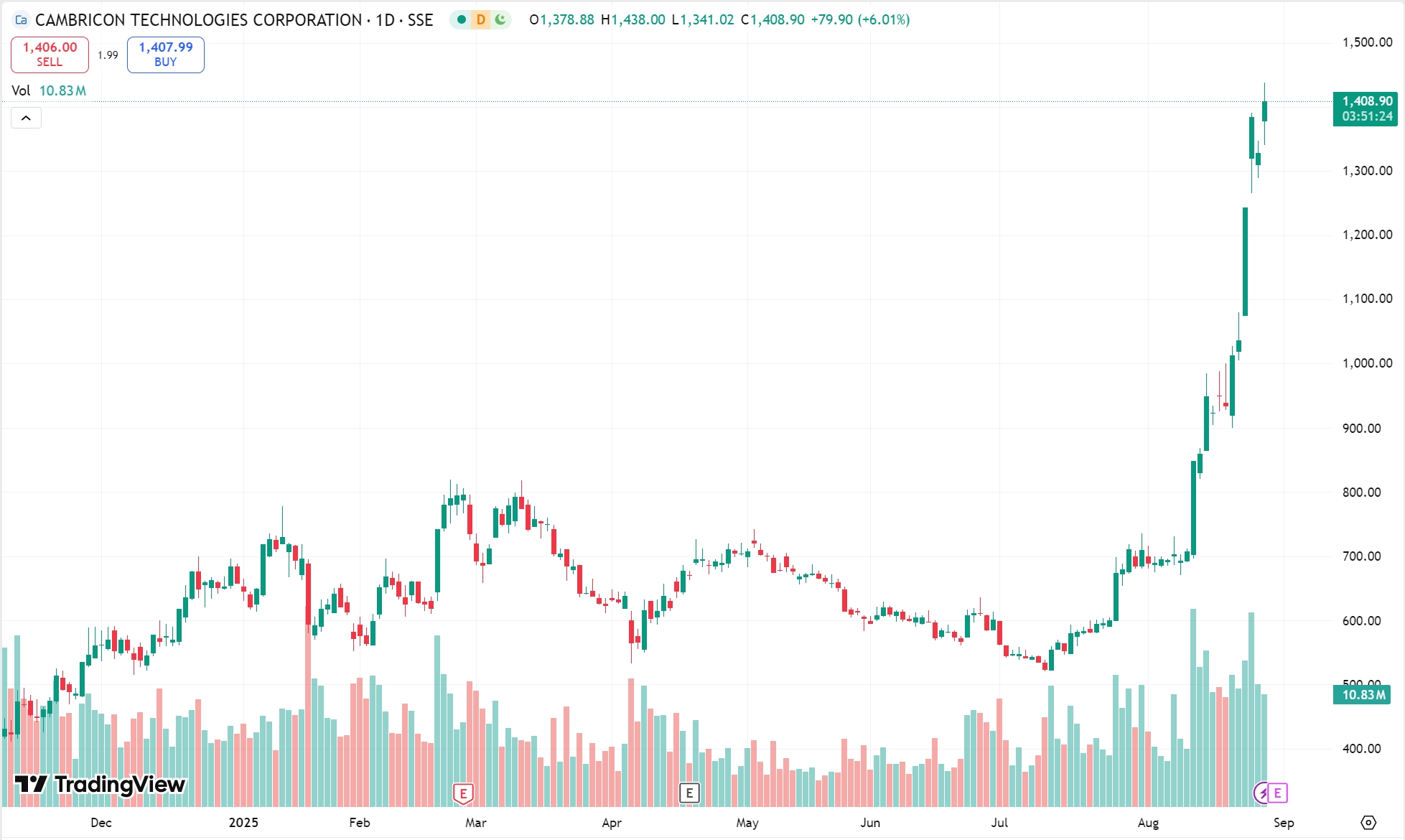 周三 A 股开盘,寒武纪股价飙升 8%,盘中股价一度达 1438 元。截至午间收市,涨幅收窄至 6%,报 1408.9 元。此前高盛上调公司 12 个月目标价,由 1223 元大幅提升 50% 至 1835 元。
