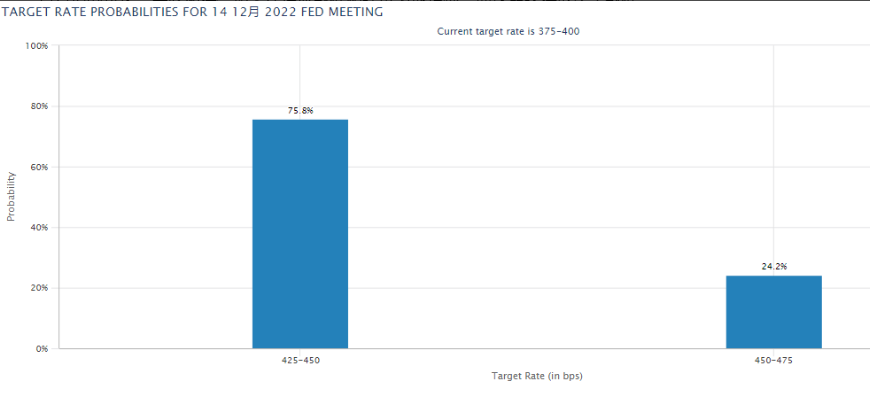 会议纪要发布后,芝商所利率观察工具 FedWatch 显示,市场预计 12 月 14 日美联储会议上加息 50 个基点的概率接近 70%。
