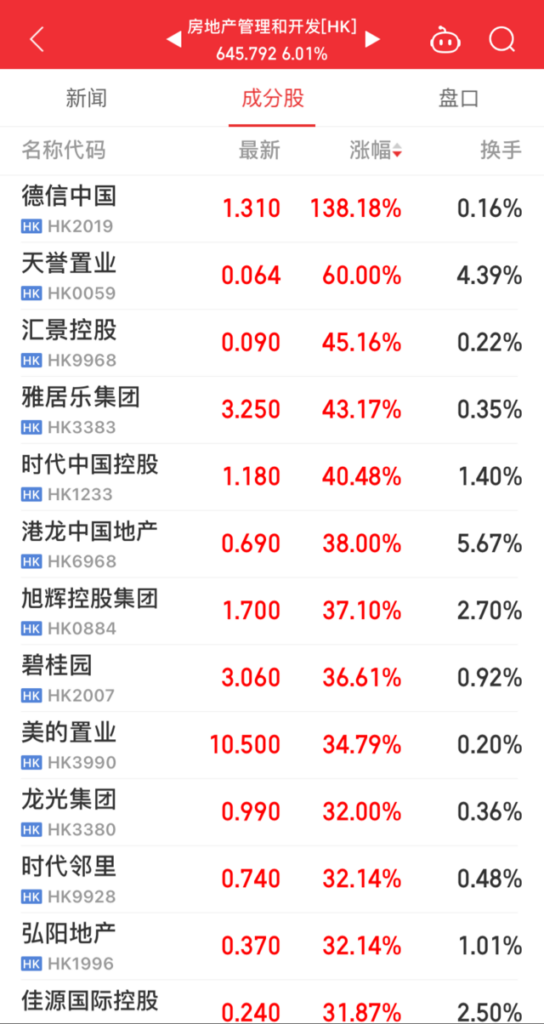 中国人民银行、中国银保监会于 11 月 13 日发布了《关于做好当前金融支持房地产市场平稳健康发展工作的通知》,公布了 16 条措施支持房地产市场平稳健康发展。受此政策影响,中国债市大跌,地产债大涨,地产股如雅居乐暴涨超 40%、德信中国涨超 138%、碧桂园和旭辉控股涨逾 35%。