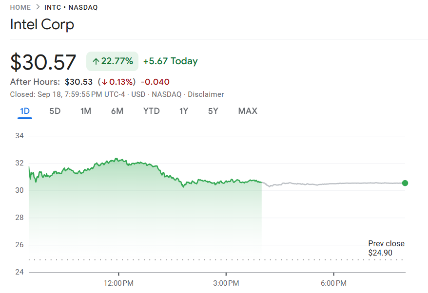 受消息提振,英特尔股价盘中一度飙涨逾 27%,收盘涨超 22%。