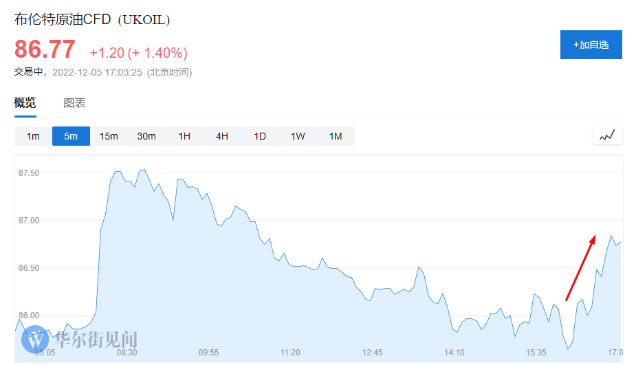 12 月 5 日,油价开盘走高,截至目前布伦特原油上涨 1.40%,报价 86.77 美元/桶;WTI 原油涨 1.41%,报价 81.11 美元/桶。