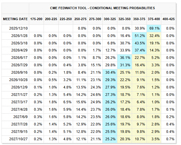 纪要还指出,一些成员警告人工智能(AI)题材估值过高,可能引发金融市场无序调整;多数决策者支持自 12 月起暂停资产负债表缩减(缩表),以缓解流动性压力。会后,主席鲍威尔强调 12 月降息“并非板上钉钉”,而政府停摆导致就业数据延迟公布,也使市场对进一步降息的预期有所降温。