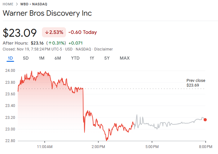11 月 19 日至 20 日,《华尔街日报》报道,Paramount Skydance(PSKY)对华纳兄弟探索(WBD)的最新收购报价仍徘徊在每股约 23.5 美元区间,未能达到市场预期。此前《Variety》曾称报价超过每股 28 美元,但该消息已被 PSKY 否认,令投资者情绪明显降温,WBD 股价下跌 2.5%。