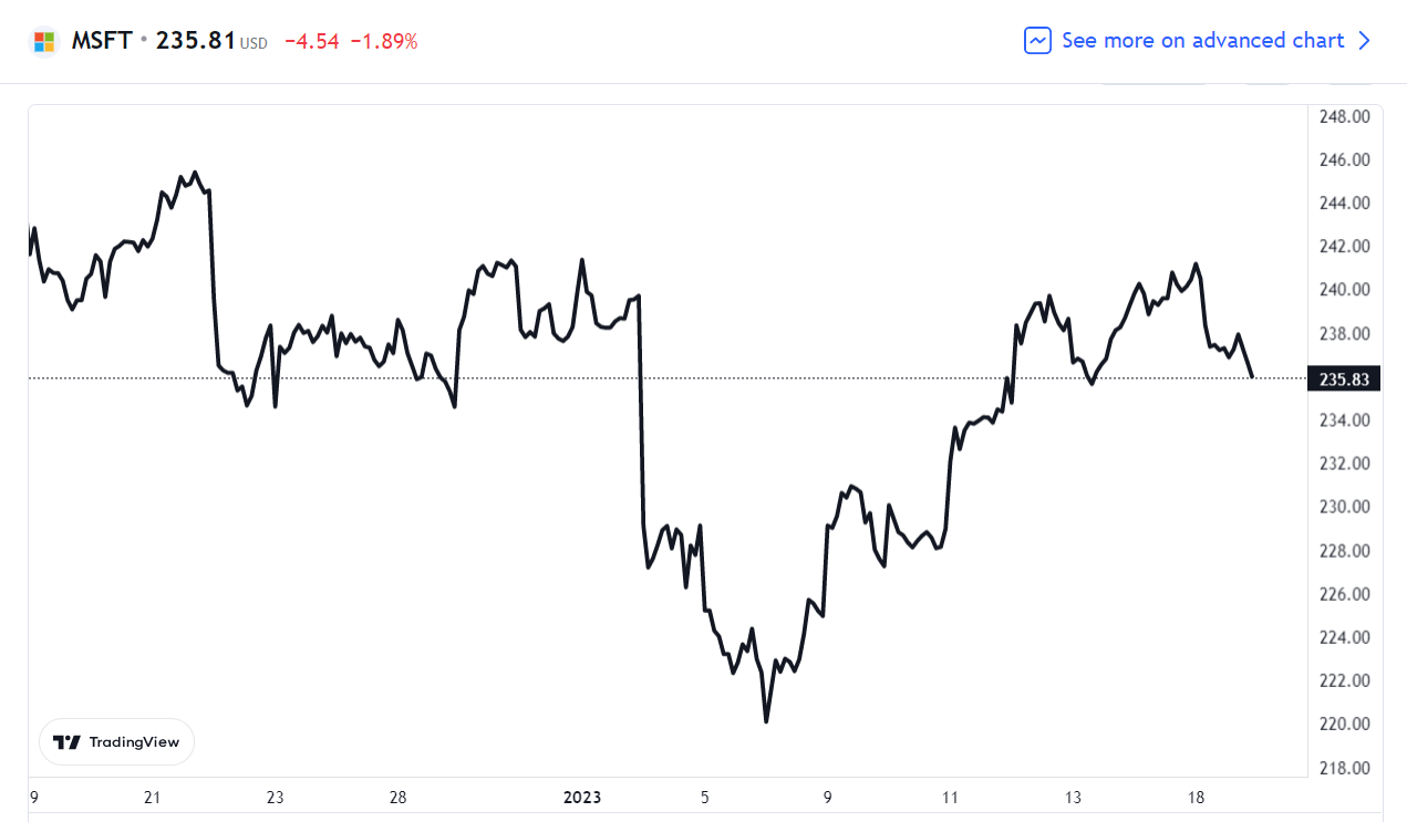 消息公布后,微软股价在美股收跌 1.89%,报 235.81 美元。