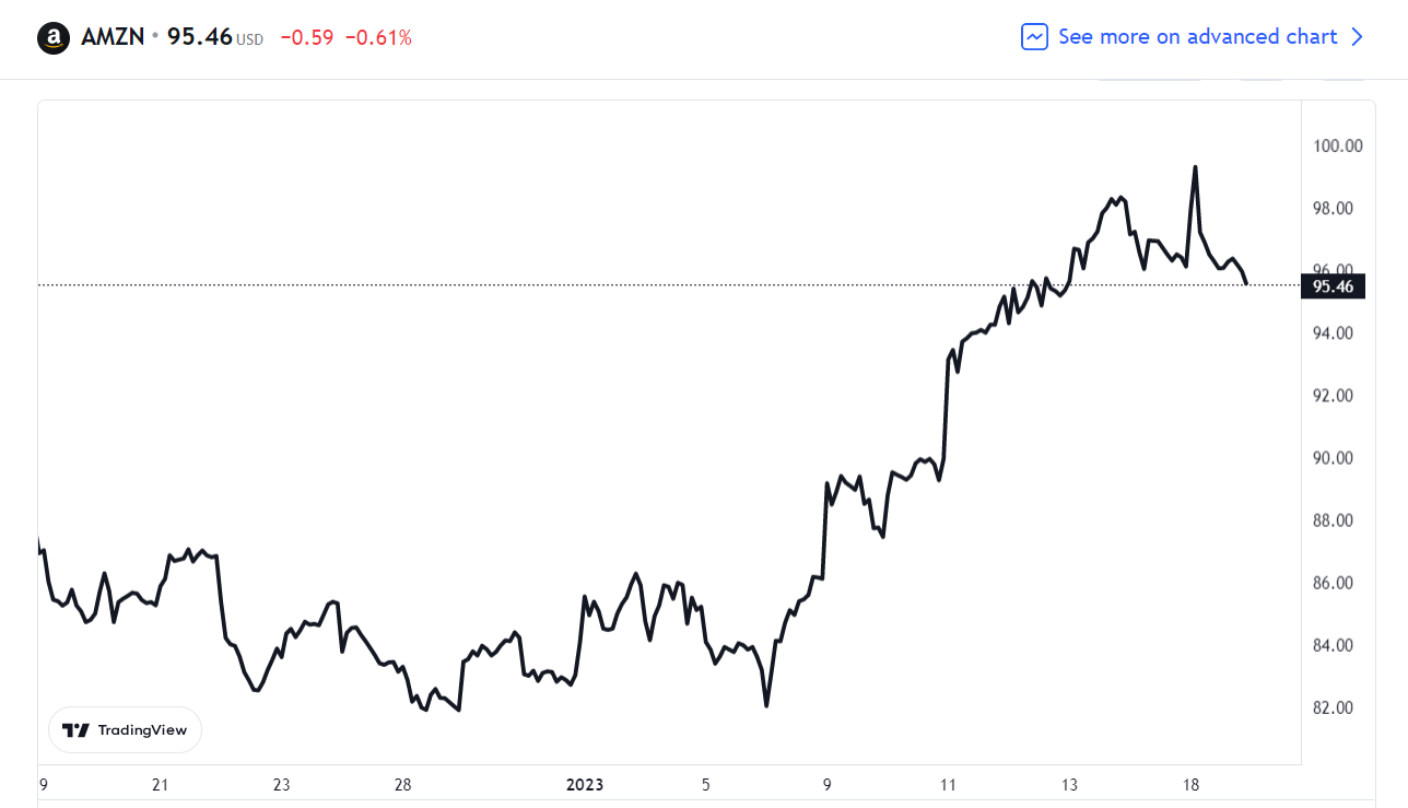 1 月 18 日亚马逊股价同样收跌,报 95.46 美元,日内微跌 0.61%。