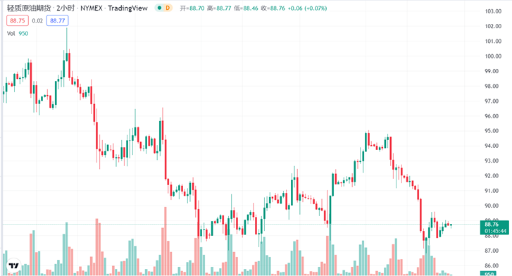 两种油价均连跌两日,延续上周五约 2% 的跌势。美油 WTI 周一最深跌 5.23 美元或跌 5.7%,日低失守 87 美元,创今年 2 月初以来最低,进一步重返俄乌冲突爆发之前的水平。国际布伦特最深跌至 5.35 美元或 5.5%,日低失守 93 美元,也创 2 月中旬来最低。