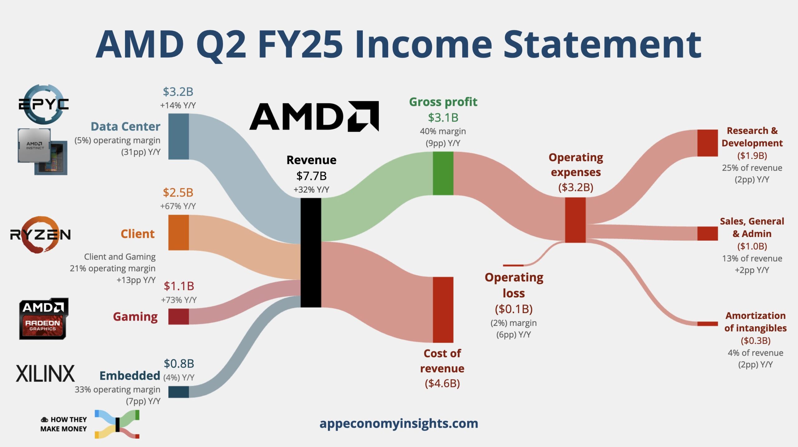 AMD 第二季度财报表现不及预期,盘后股价下跌逾 6%。数据显示,公司营收同比增长 32% 至 77 亿美元,略高于分析师预期的 74.3 亿美元,但调整后每股收益为 0.48 美元,低于市场预期的 0.49 美元。