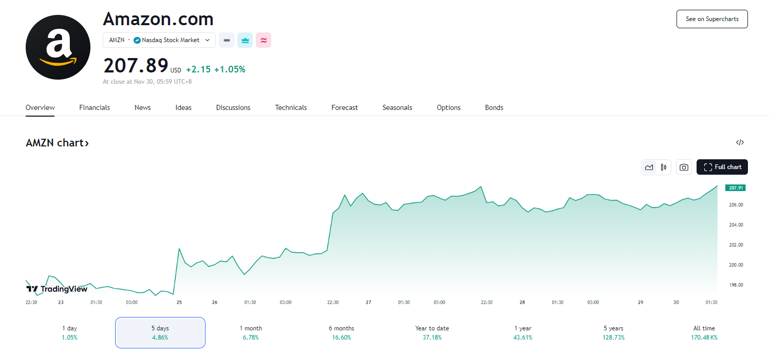 然而,亚马逊股价似乎不受影响,上周累计涨 5.46%,上周总成交额 276.95 亿美元;29 日收盘,亚马逊涨 1.05%,报 207.89 美元。