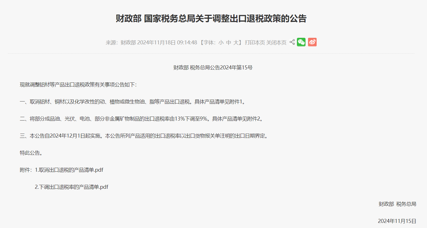 11 月 15 日,中国国家财政部、税务总局发布《关于调整出口退税政策的公告》。