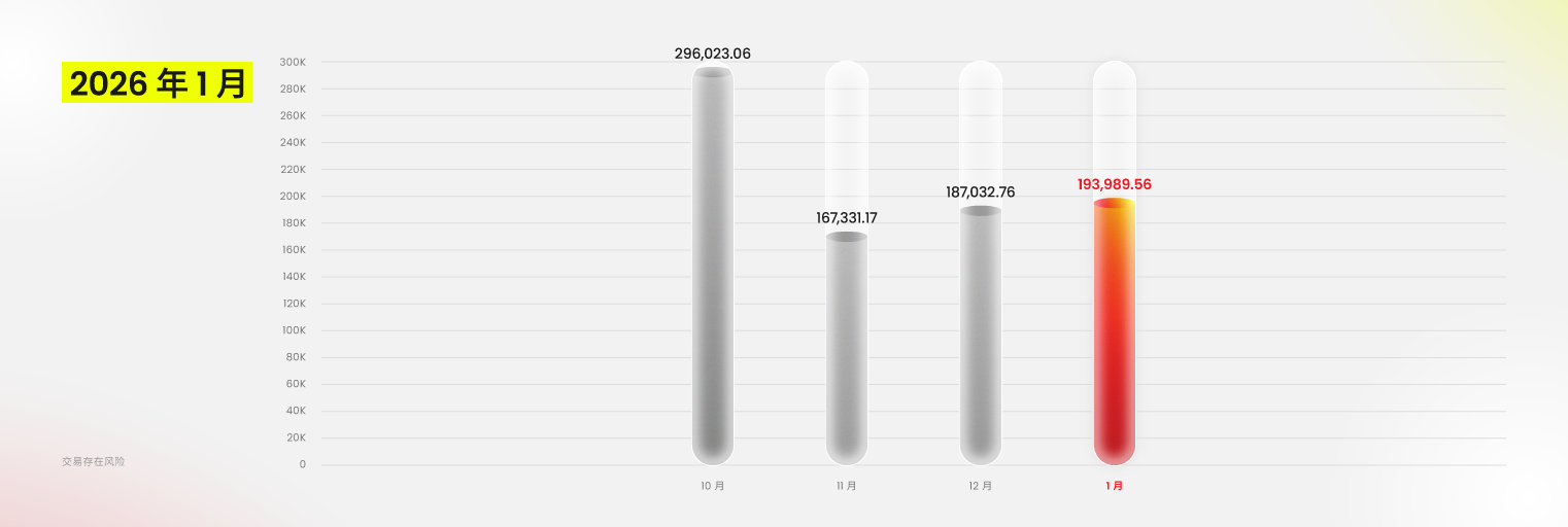 1 月作为 2026 年开年首月,全球金融市场呈现极端波动与政策博弈深度交织的格局,美联储 1 月议息会议暂停降息、核心领导层人事提名变动,叠加黄金、工业金属等资产价格的史诗级震荡,有效维持了市场交易活跃度,推动平台交易量实现小幅上扬。