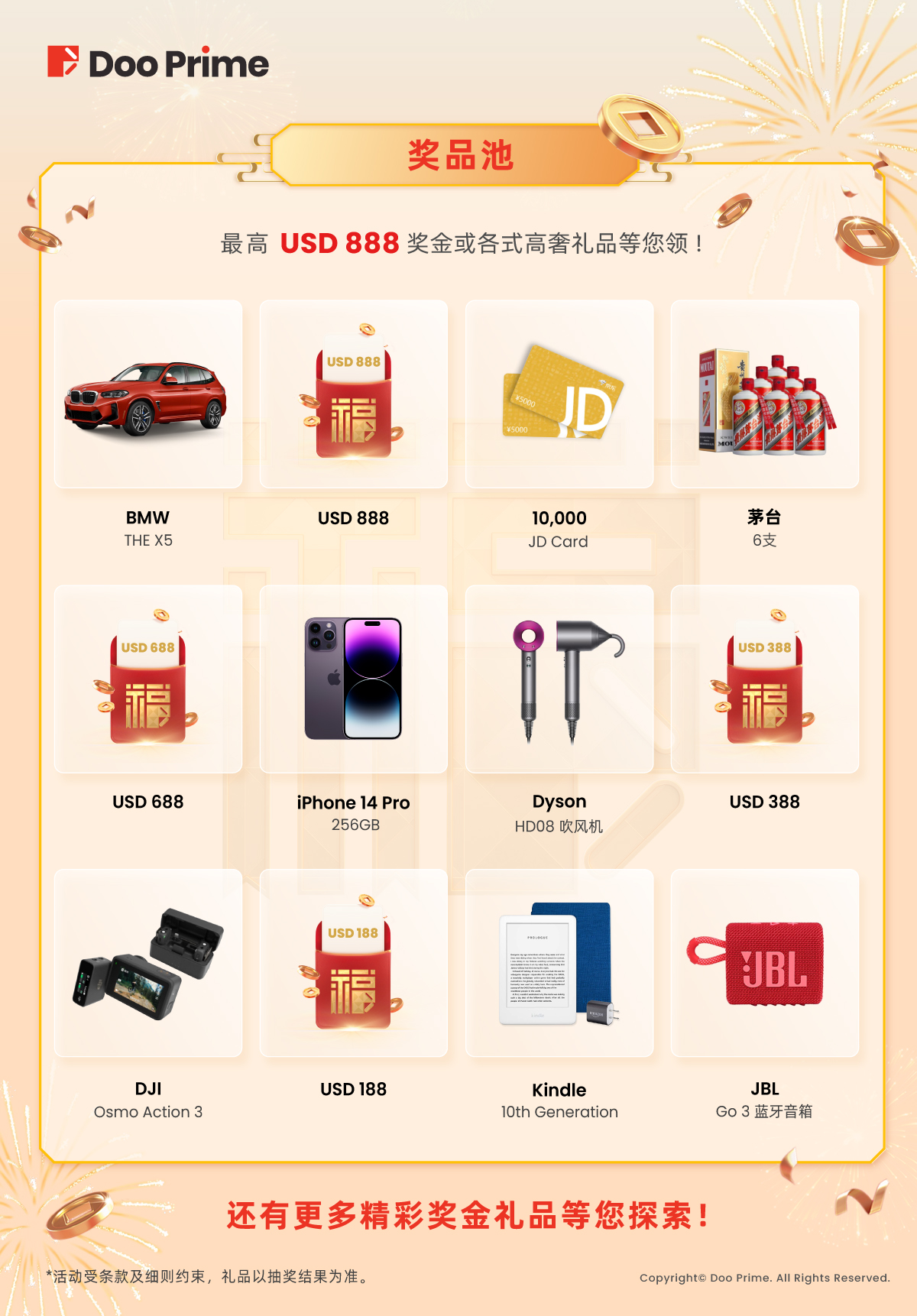 本次活动的日期将会横跨整个新春佳节,希望 Doo Prime 精心准备的开年全球大抽奖能够将一年的好运送给每位客户,还有许多现金红包和豪礼等着您领取,抓紧机会,万勿错过!