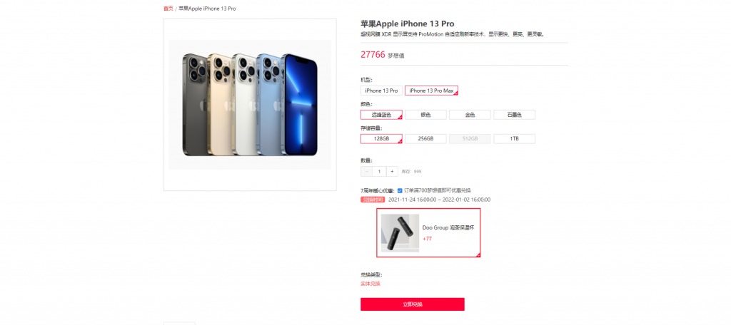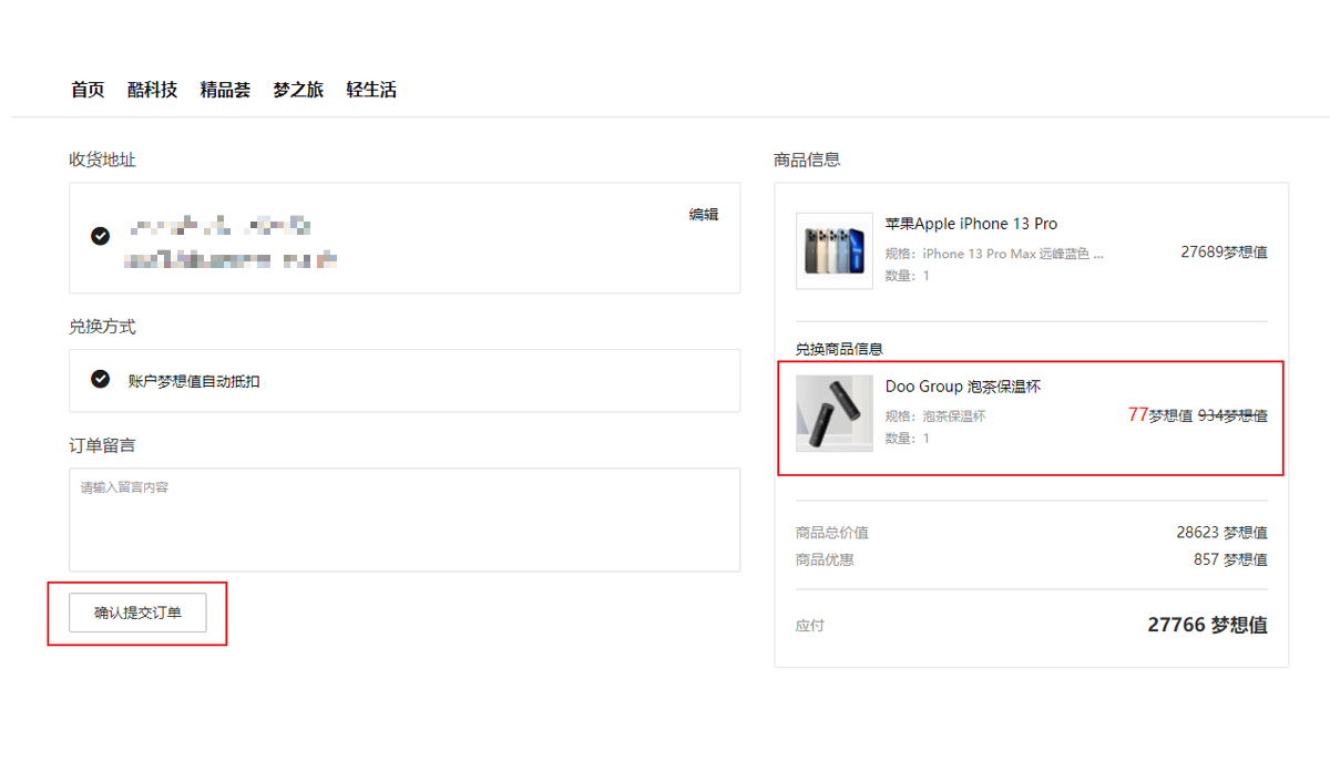 1. 选择礼品规格及数量(单一订单必须满 700 梦想值),然后以77 梦想值的优惠价 ,兑换“Doo Group 限量版泡茶保温杯”