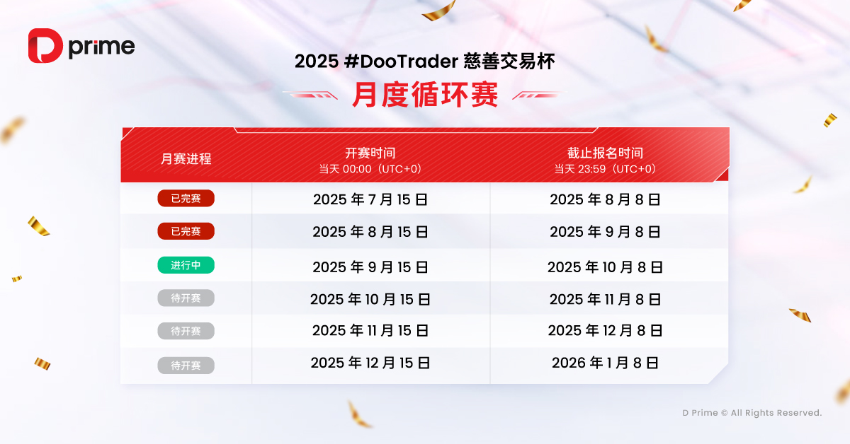 2025 年 D Prime #DooTrader 慈善交易杯第二轮月赛已于 9 月 14 日 23:59(UTC+0)圆满收官,榜单已火热出炉!第三轮月赛紧随于 2025 年 9 月 15 日 00:00(UTC+0)开赛 —— 欢迎各路交易高手立刻报名,争夺岛屿巅峰赛线下决赛名额!