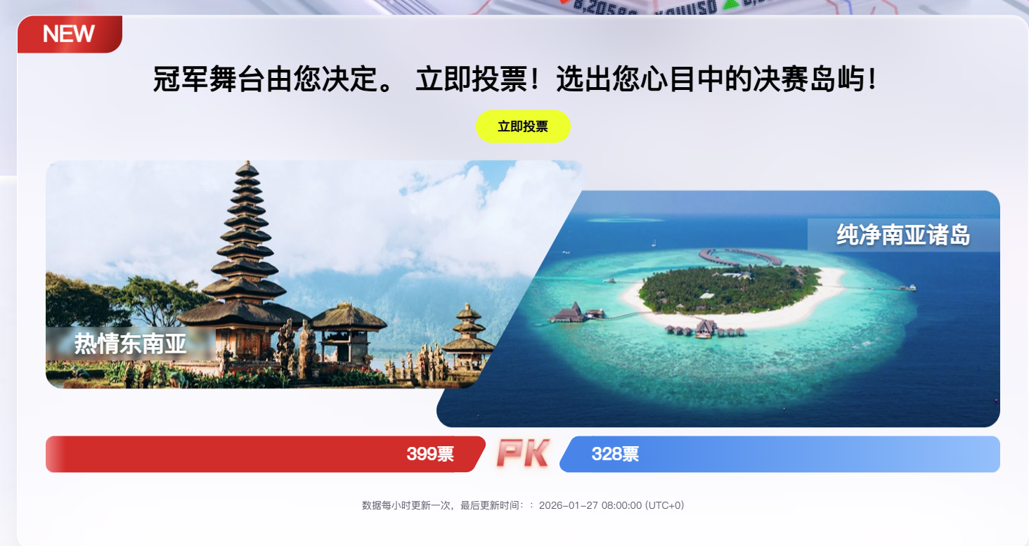 投票通道将于 2026 年 1 月 31 日 23:59(UTC+0) 截止,届时得票最高的地点将成为 D Prime #DooTrader 慈善交易杯决赛举办地。赶紧前往活动主页投票,为您心目中的理想岛屿投出关键一票!