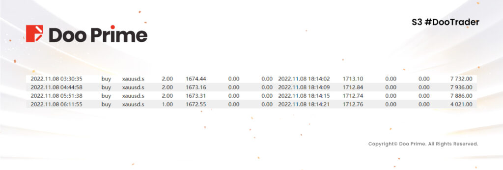 其后在 11 月 7 日至 11 月 8 日期间,由于 XAUUSD 整体行情趋向窄幅震荡,Xue YanqXXX 的交易偏向于耐心和谨慎,但是随着 11 月 8 日 XAUUSD 快速拉升,突破震幅区间,Xue YanqXXX 随即把交易头寸放大至 2 – 10 手,两日收获 5,000+ 的收益。