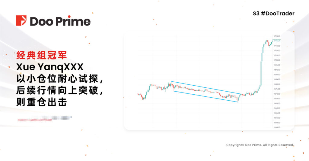 经典组冠军 Xue YanqXXX 以 1323% 的收益率冠绝群雄,勇夺经典组冠军,更令人称奇的是他在第二轮的比赛中前十榜单上是交易天数是最少的选手,细观其比赛期间的交易记录,诠释了交易如同狩猎,优秀的交易员亦如经验丰富的猎手,需要极大的耐心来等待良机出现,如果机会来临,则需要一击必中。