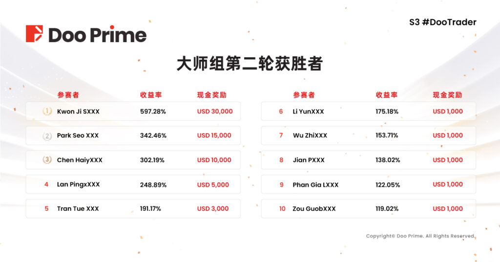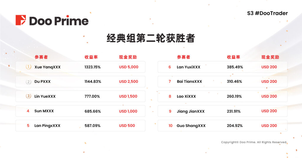 2022 年 S3 #DooTrader 慈善杯全球交易大赛第二轮赛事已于 12 月 14 日圆满结束,至此由 Doo Prime 全力升级打造的本届交易大赛成功落下帷幕。历经近 3 个月的激烈对决,大师组和经典组两轮赛事共 20 位优秀选手,瓜分丰厚奖金,更吸引了来自世界各地的投资高手齐聚一堂切磋交易技艺,引起了业内的广泛关注。