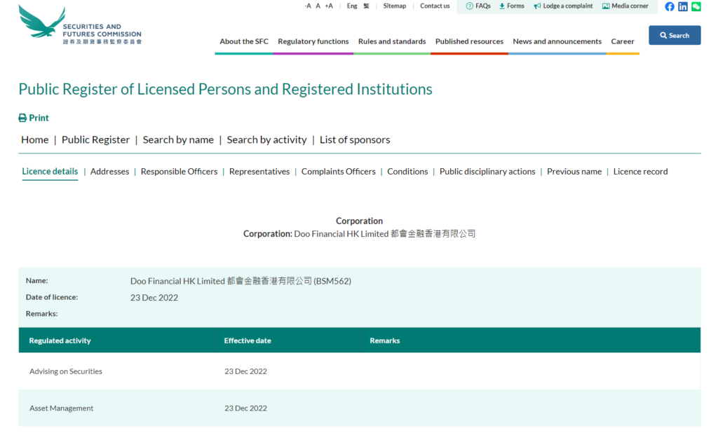 Doo Financial HK Limited Được Cấp Giấy Phép Loại 4 & Loại 9 Bởi Ủy Ban Chứng Khoán Và Hợp Đồng Tương Lai Hồng Kông (HK SFC)