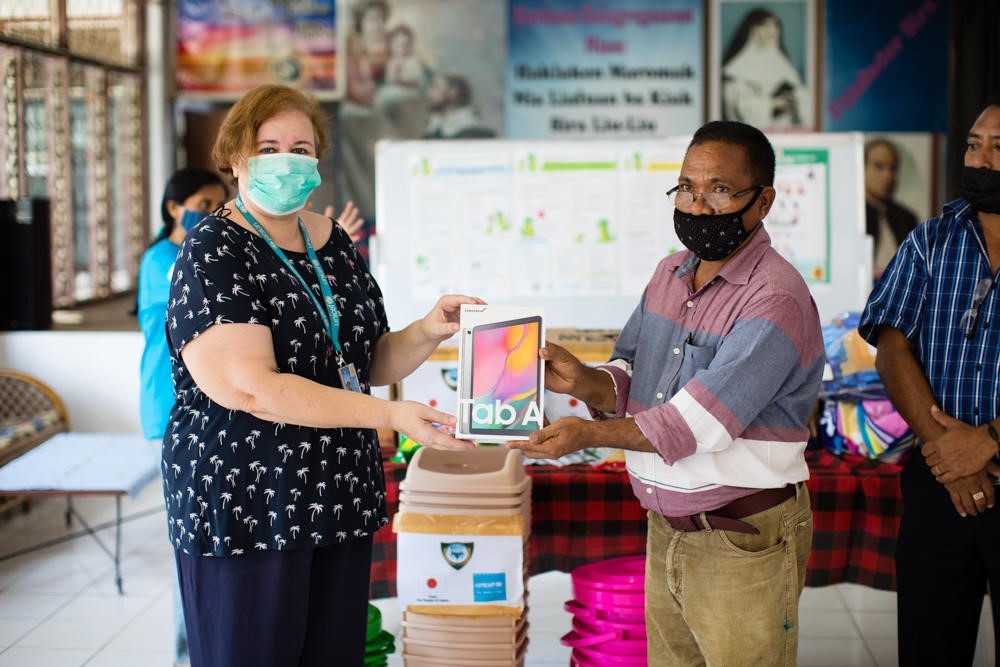 Đại diện của UNICEF tại Timor-Leste, Valérie Taton, đã tiến hành trao máy tính bảng cho Bộ Đoàn Kết và Lao Động Xã Hội tại một cơ sở chăm sóc nội trú cho trẻ em ở Dili. Số máy tính bảng trên sẽ được sử dụng nhằm mục đích theo dõi phản ứng với COVID-19 do chính cơ quan này đảm nhận.