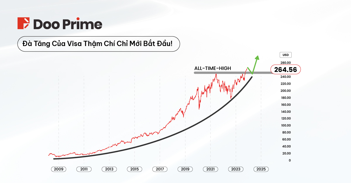 Từ góc nhìn kỹ thuật, cổ phiếu Visa đang được giao dịch ở mức cao nhất lịch sử. Điểm mua lý tưởng nhất có thể là khi giá hồi về vùng 250-240, sau đó nắm giữ dài hạn.