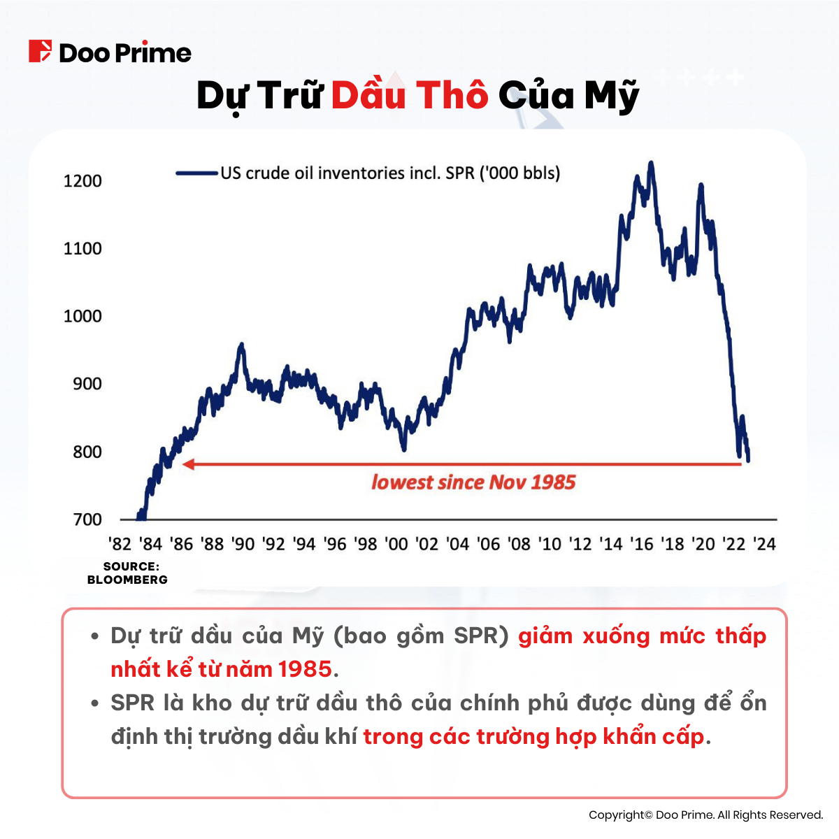 Trữ Lượng Dầu Chiến Lược (SPR) đang sụt giảm ngày qua ngày. Giá dầu cao chính là nguyên nhân chính dẫn đến lạm phát, khiến Fed và chính quyền Mỹ phải đau đầu giải quyết trong 2 năm gần đây. Nếu OPEC+ và Nga tiếp tục giảm sản lượng dầu, điều này sẽ đẩy trữ lượng giảm xuống và tăng nguồn cầu. Từ đó, giá đầu sẽ bị đẩy lên mức rất cao và tiến tới vùng 90-100 USD trong cuối năm nay.
