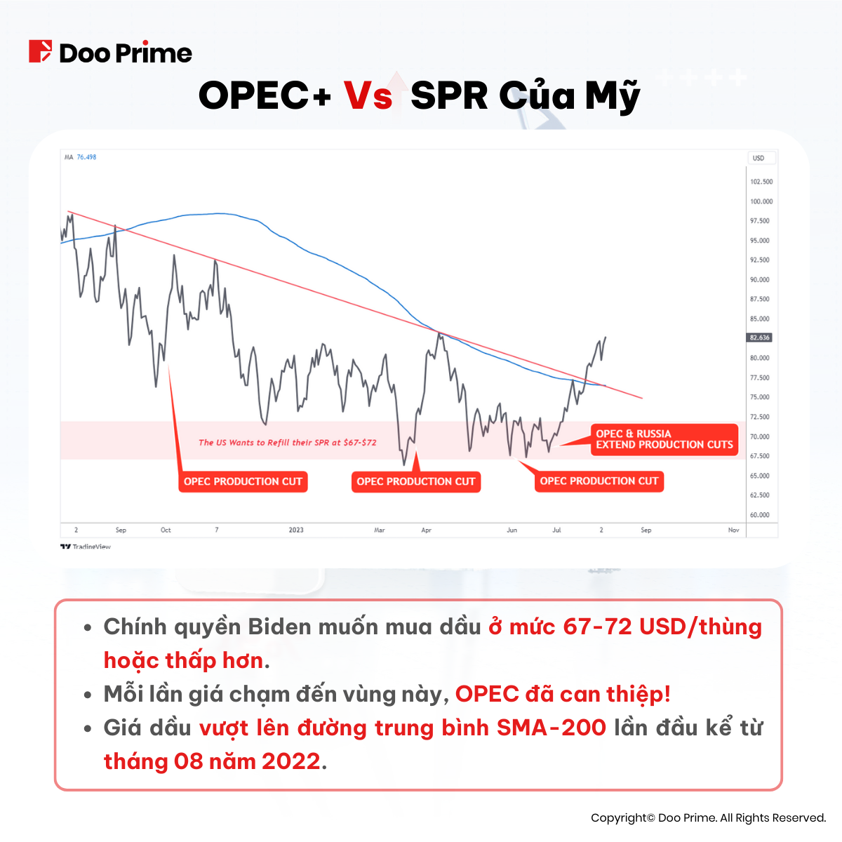 Ngay sau đó, Ả Rập Saudi và Nga tiếp tục cắt giảm dầu thô. Trong năm nay, đây không phải là lần đầu OPEC có động thái khi giá dầu tiến đến vùng 67-72 USD. Liệu đây có phải là một sự trùng hợp?