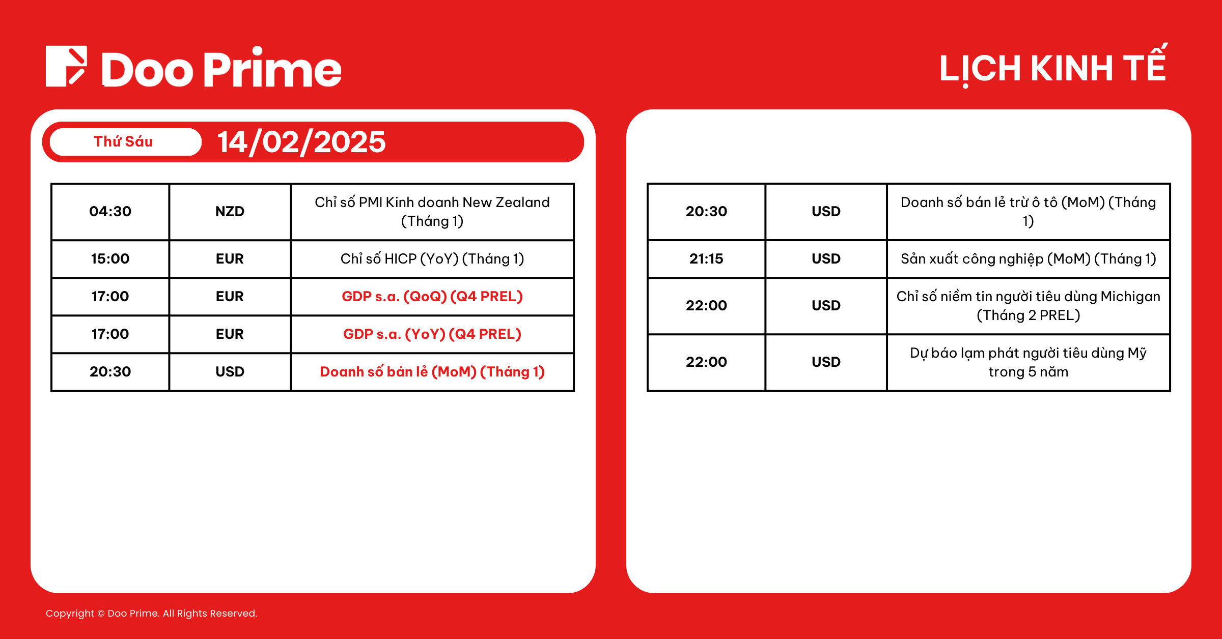 Doo Prime xin thông tin đến bạn những sự kiện kinh tế nổi bật từ 10/02 đến 14/02/2025.